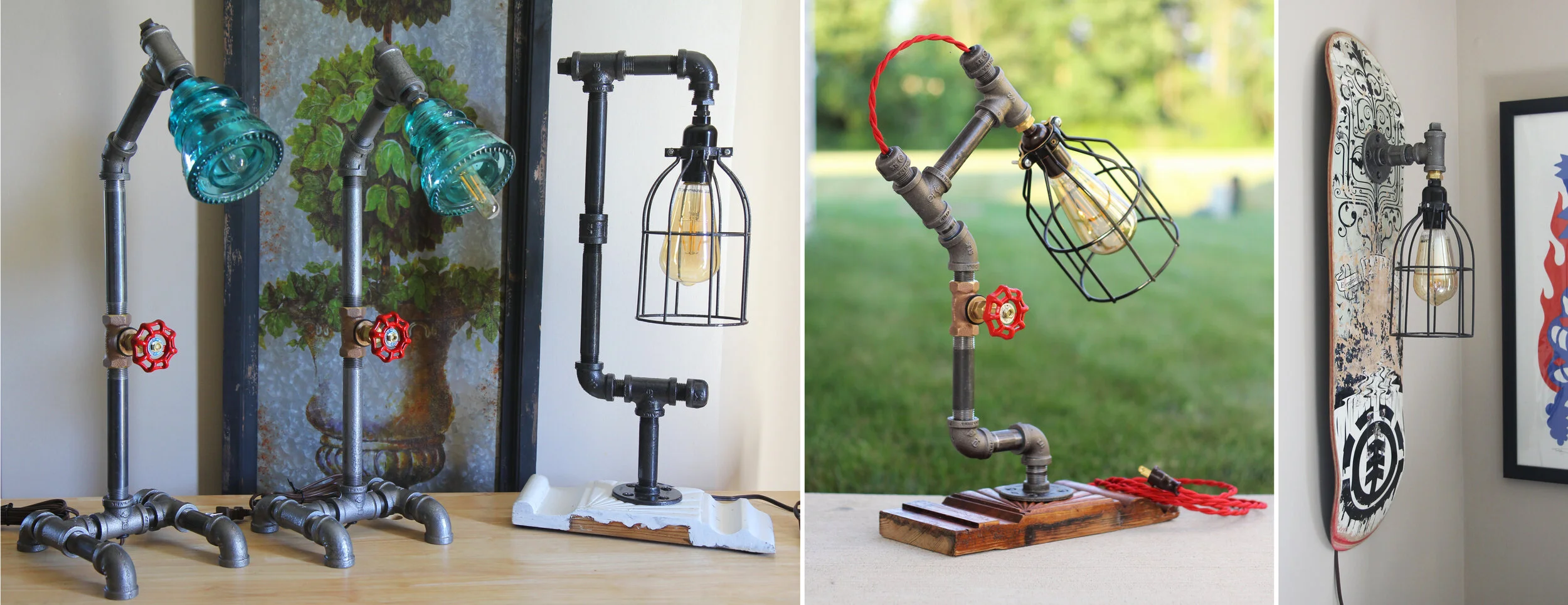 This billboard display advertises a way to reach and shop for pipe lamps and other industrial home decor.